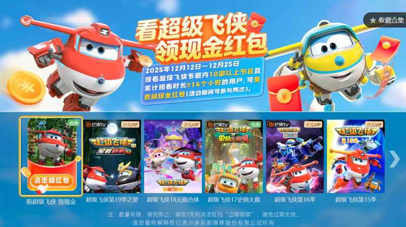 活动期间,观看超级飞侠专题页面内10部以上节目,且时长大于14小时的用户,可以免费领现金红包,数量有限,发完即止。