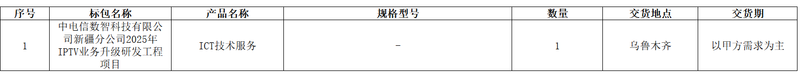 本询比项目为,中电信数智科技有限公司新疆分公司,2025年IPTV业务升级研发工程项目,(标段编号:ETBBFA202512100014),采购人为中国电信股份有限公司和田分公司,采购代理机构为,广西壮族自治区通信产业服务有限公司。项目资金已落实。具备采购条件,现进行公开询比,特邀请有意向的且具有提供标的物能力的潜在供应商,(以下简称供应商)参加询比响应: