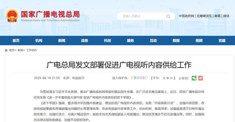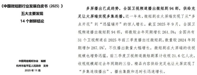 另一方面,在2025年8月,广电总局还印发实施《进一步丰富电视大屏内容 促进广电视听内容供给的若干举措》,也明确表示要增加优质广电视听内容供给,其中提到鼓励支持优秀微短剧进入电视播出。