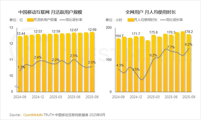 QuestMobile近期发布的《2025中国移动互联网秋季大报告》显示,2025年9月,全网用户规模达到12.69亿,月人均使用时长达178.2小时,同比增长8.2%,增速创下近一年最高值。这侧面反映着各类移动互联网应用对用户时间和注意力的争夺进一步加剧。