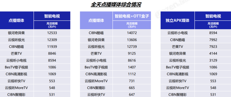 根据勾正科技发布的《2025年10月智能电视大数据报告》显示,10月各点播媒体月活相比上月有小幅上升。其中智能电视+OTT盒子终端的CIBN酷喵、银河奇异果、云视听极光三大头部应用,月活规模均突破亿级。