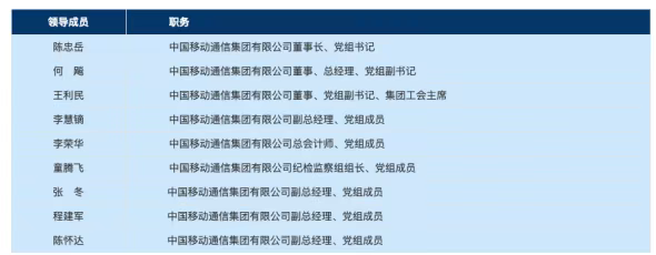 2025年10月28日,中国移动通信集团有限公司召开中层以上管理人员大会。中央组织部有关负责同志宣布了党中央关于中国移动通信集团有限公司主要负责同志调整的决定:陈忠岳同志任中国移动通信集团有限公司董事长、党组书记,免去其中国联合网络通信集团有限公司董事长、党组书记职务;免去杨杰同志的中国移动通信集团有限公司董事长、党组书记职务。