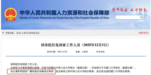 人力资源和社会保障部网站12月3日消息,国务院任免国家工作人员。其中,免去董昕的国家广播电视总局副局长职务。