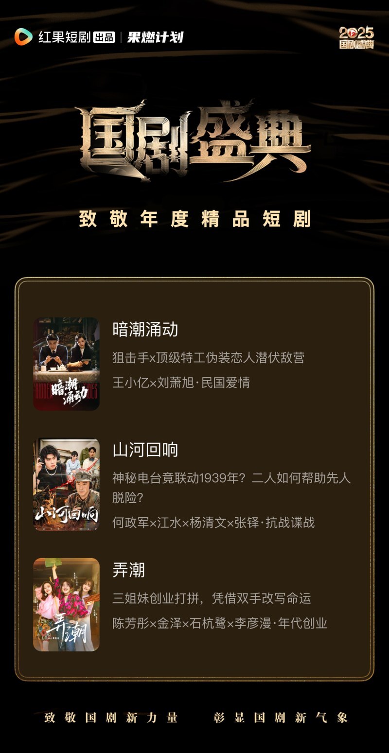 12月16日,安徽卫视《2025国剧盛典》成功举办。盛典紧扣“破局而立·剧力向新”的年度主题,回顾了一众优秀国剧人与时代共振、与人民共情的创作足迹,展现了行业在“破局”中探索、其中,红果短剧“果燃计划”推出的《山河回响》,《暗潮涌动》《弄潮》以紧凑叙事传递时代强音,凭借独特美学拓宽短剧内容边界,获评“致敬年度精品短剧”。
