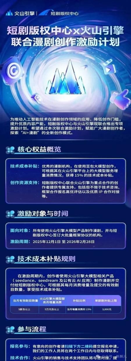 12月16日,抖音集团短剧版权中心联合火山引擎,发布漫剧创作激励计划。从公布的海报来看,该计划面对所有使用火山引擎,大模型产品制作漫剧且与,版权中心签订大批量框架协议的机构。