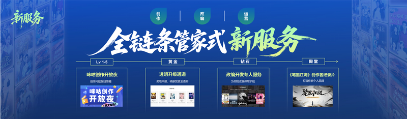 对于作者与编剧,平台构建了从创作到运营的闭环服务:“咪咕创作开放夜”提供实时在线答疑;透明的“升级通道”让成长路径清晰可见;“改编开发专人服务”为 IP 影视化保驾护航;而《笔墨江湖》创作者纪录片则致力于打造作家个人品牌。