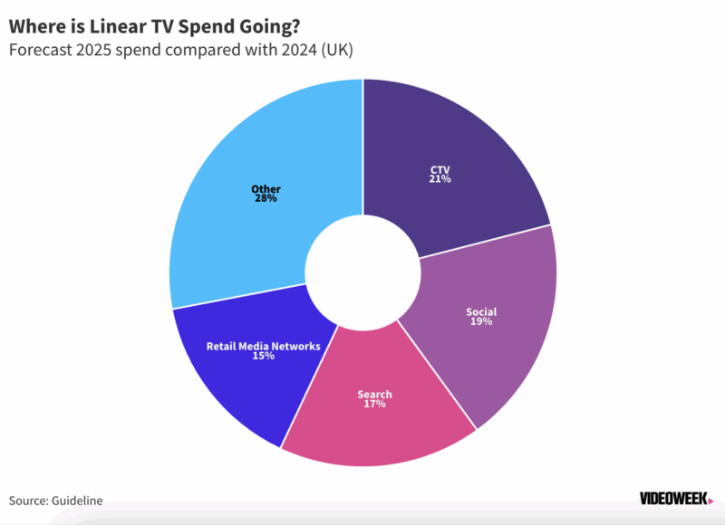 鉴于这些因素,即使观看行为转向联网电视环境,线性电视支出也并未按同比例重新分配到联网电视。根据Guideline的数据,每从线性电视流出一英镑,只有21便士会重新投入到联网电视,而社交媒体(19%)、搜索引擎(17%)和零售媒体网络(15%)都会从线性电视预算中分得一杯羹。