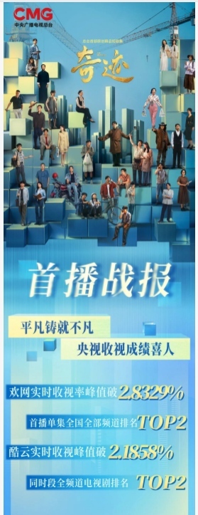 12月22日,由中央广播电视总台携手深圳共创的,精品短剧集《奇迹》首播后,收视率与网络热度双双表现强劲:酷云实时收视峰值2.1858%,同时段全频道电视剧排名top 2;腾讯站内开分9.5,剧集频频位列,腾讯电视剧期待榜首位;微博热搜开播日超135条,抖音平台上主话题“总台首部原创精品短剧集奇迹”,播放量超1.9亿。