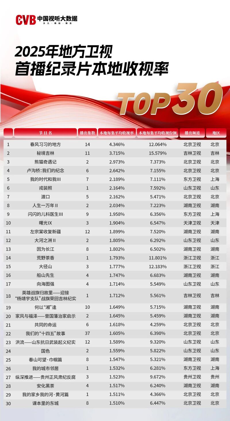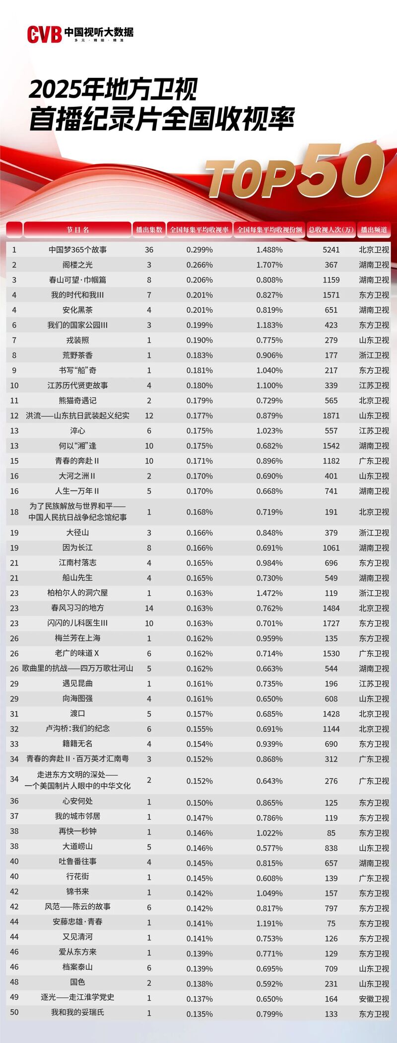 CVB数据显示,围绕纪念抗战胜利80周年这一重大历史节点,今年7至12月,总局系统谋划,全国卫视形成合力,先后播出抗战题材纪录片2630集,总时长超957小时,累计收视规模达22.2亿人次,成为重要时间节点、重大宣传中不可或缺的节目载体。这些纪录片注重个体叙事与情感共鸣表达相结合的方式,将宏大主题进行精细化表达,把历史转化为可感、可触、可共鸣的具象故事,增强了主题传播的感染力与穿透力。《胜利》(CCTV1)回顾中国人民14年艰苦卓绝的抗战历程,首播期间全国收视率2.955%,全国范围内首重播累计收视人次超3.7亿。《胜利日——大阅兵2025》(CCTV7)通过展现战士筹备阅兵的幕后故事,累计收视3287.4万人次;《东北抗联》(CCTV9)首集播出后带动频道收视率较前期上涨11.3%,登陆辽宁等省级卫视频道播出后,全国累计收视4349.4万人次。《卢沟桥:我们的纪念》(北京卫视)登陆19个省级卫视频道播出,累计收视人次超1.1亿。《淬心》(江苏卫视)首播期间本地收视率0.531%,各集均位列当地同时段地方卫视节目收视率首位。《心安何处》(东方卫视)通过寻访中日遗孤老人的生活现状,揭示战争罪行,首播收视率较当月频道播出纪录片平均水平高52.7%。《烽火赤子心》(广东卫视)首播期间广东本地平均收视率0.603%,各集均位列当地同时段地方卫视节目收视率首位。《洪流——山东抗日武装起义纪实》(山东卫视)跻身今年地方卫视首播纪录片收视率第十二,累计收视人次达1871.3万。《我是八路军》(河北卫视)首播期间河北本地平均收视率0.259%,累计收视1780.3万人次。《山河印迹》(广西卫视)首播期间广西本地平均收视率0.784%,各集均位列当地同时段地方卫视节目收视率首位。