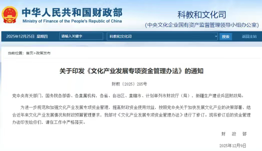 近日,财政部修订印发的《文化产业发展专项资金管理办法》于2025年12月24日起施行,本次修订将文化数字化纳入专项资金核心支持范畴,我们一起来关注下。
