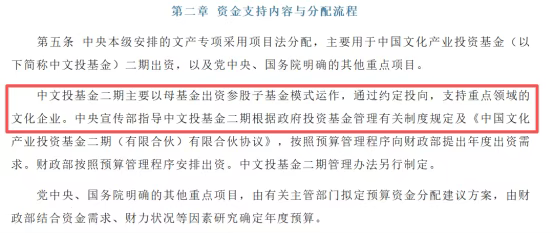 中央本级支出:主要通过出资“中国文化产业投资基金(中文投基金)二期”,以母基金参股子基金的市场化方式,引导社会资本投向重点领域。