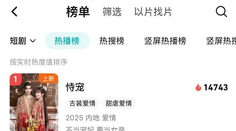 12月29日,古装短剧《恃宠》首日站内热度值便冲到了14743,一举拿下平台短剧热播榜TOP1的宝座。《恃宠》的首日登顶,只是2025年末,短剧狂潮中的一个高光瞬间。这个行业正在经历从,“流量争夺”到“品质竞争”的,深刻转变。