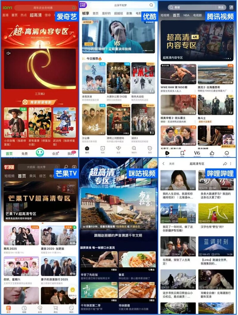 超高清内容制播能力快速提升。北京、上海、江苏、浙江、山东、湖南、广东、四川、深圳等9省市卫视超高清频道开播,我国4K、8K超高清频道数量达到18个。爱奇艺、优酷、腾讯视频、芒果TV、哔哩哔哩、咪咕视频等6家头部网络视听平台新增内容超高清占比近50%。全国新拍摄电视剧、网络剧、纪录片基本实现超高清化。