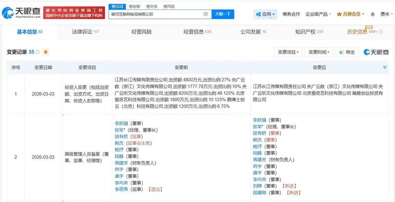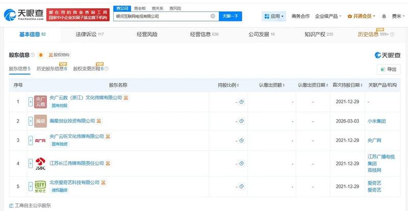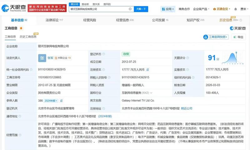 银河互联网电视有限公司成立于2012年7月,法定代表人为张军,注册资本约1.78亿人民币,经营范围包括广播电视节目制作经营、第一类增值电信业务、第二类增值电信业务等。股东信息显示,该公司现由央广云听文化传媒有限公司、北京爱奇艺科技有限公司及上述新增股东等共同持股。