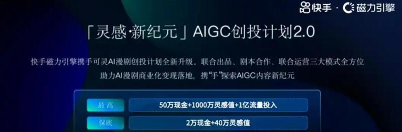 目前快手推出“灵感·新纪元AIGC创投计划2.0”。相比1.0版本主要提供算力和流量,2.0版明确加入现金保底。优质项目最高可获“50万现金 + 1000万灵感值 + 1亿流量奖励”。