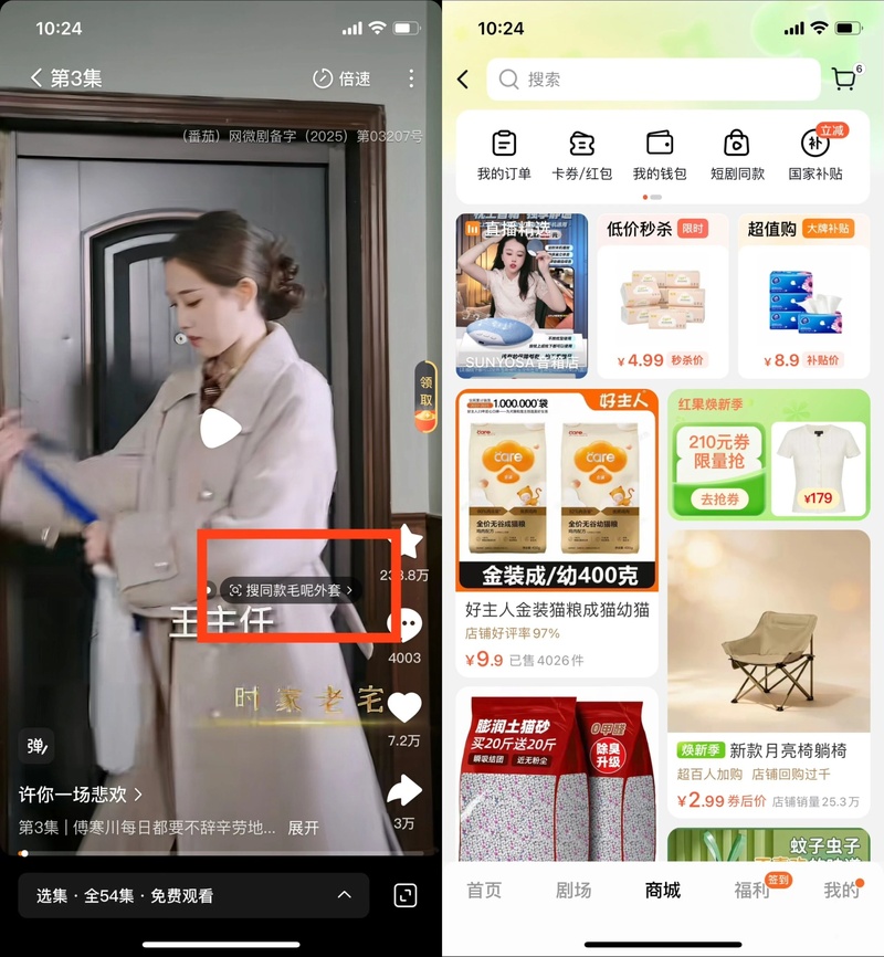 2025年10月,红果开启小范围“短剧带货”内测,用户暂停短剧时,页面会弹出“搜同款”。再之后,红果就直接把抖音商城搬进app内了。