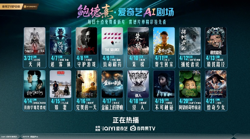 爱奇艺相对早期就开始意识到这个问题。2025年,爱奇艺与鲍德熹合作推出“鲍德熹·爱奇艺AI剧场”,同时发起了“AI影视创作营”,尝试为有创作力但缺乏技术手段的人提供帮助。鲍德熹带着几十个原本不是影视行业的人,用AI做出了16部短片,覆盖科幻、古装、奇幻、现实等题材,首部《天问》上线9小时登顶爱奇艺风云榜飙升榜Top1。这些作品证明了:非专业人士在专业导师的带领下,用对的方法和工具,也能做出专业水准的内容。