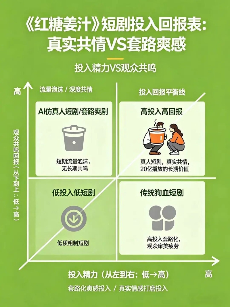 这个时代的技术越发达,我们越容易陷入一种错觉,以为更快的、更强的、更智能的,就是更好的。AI短剧可以批量产出冲突、制造工业糖精,用最短的时间堆砌爽点,却给不出一段能让人真正共情的人间烟火。但《红糖姜汁》提醒了所有人:在情感消费的领域,人们最终渴望的,恰恰是那些无法被加速的东西。一杯姜汁需要时间熬,一段感情需要时间来守护。