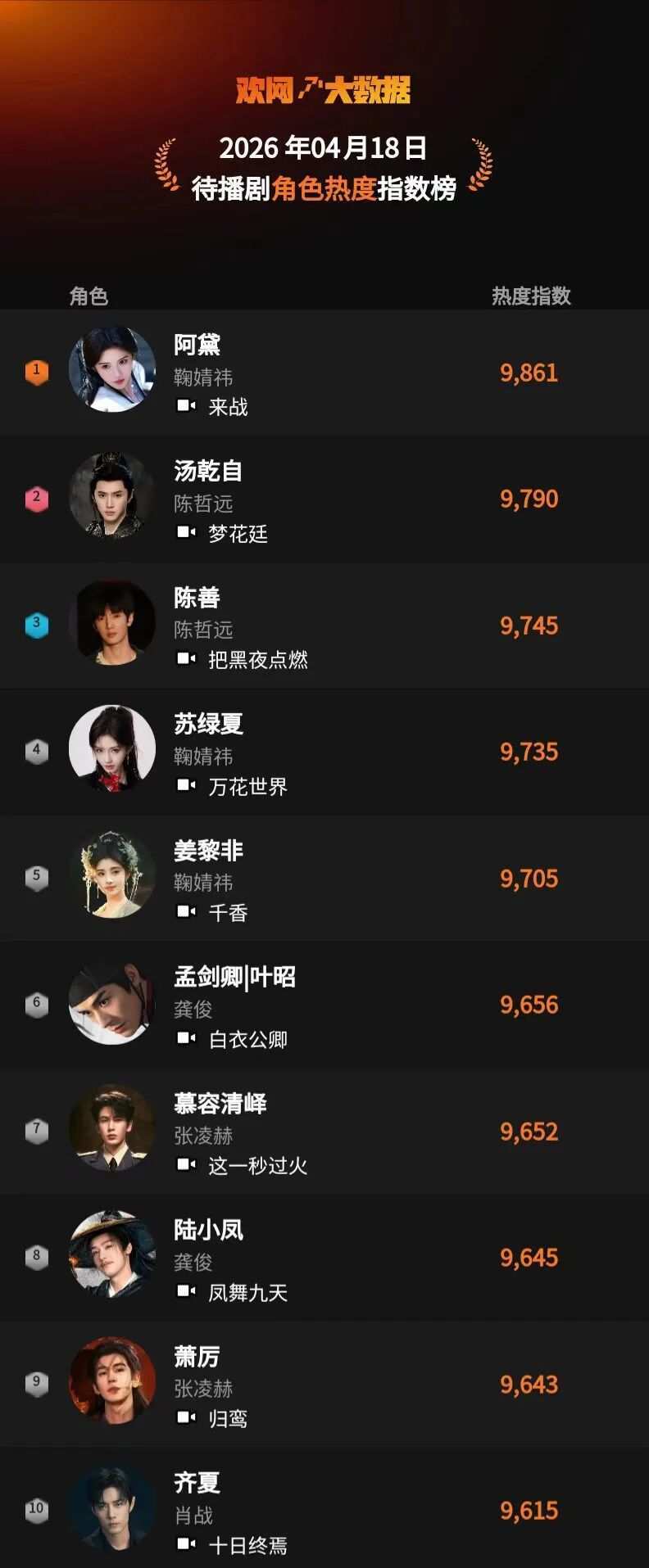 4月18日 欢网大数据【待播剧】角色热度指数TOP10来啦!