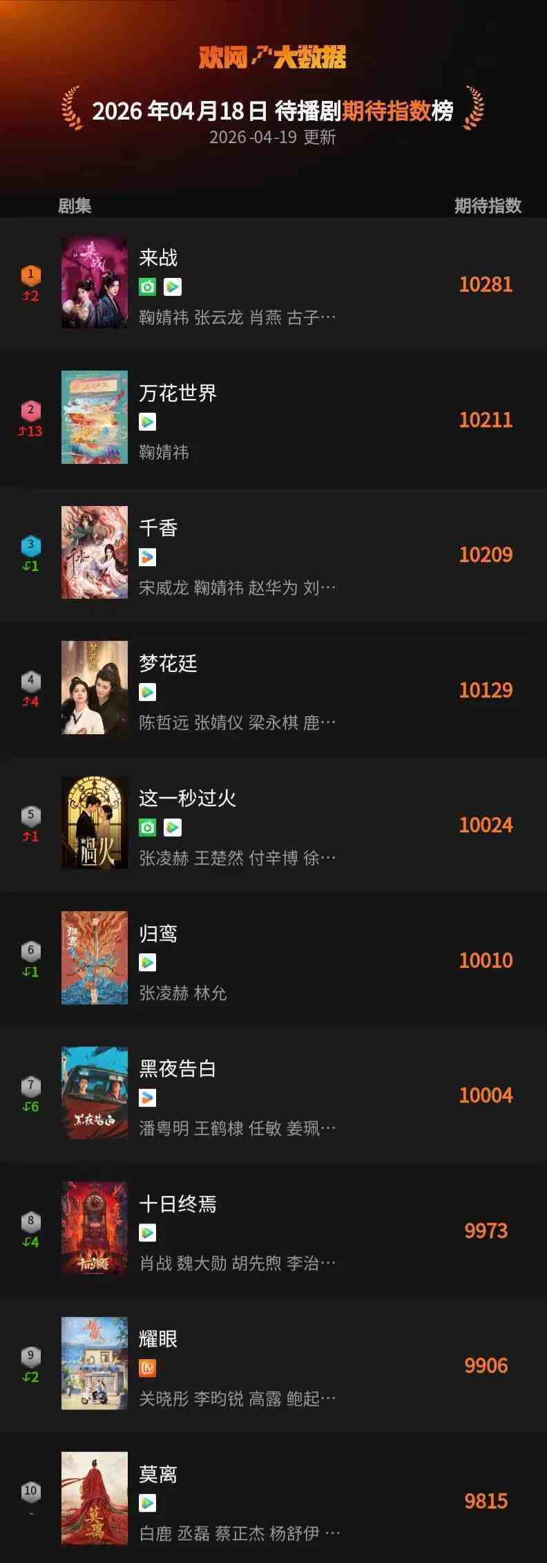 4月18日 欢网大数据【待播剧】期待指数TOP10来了!