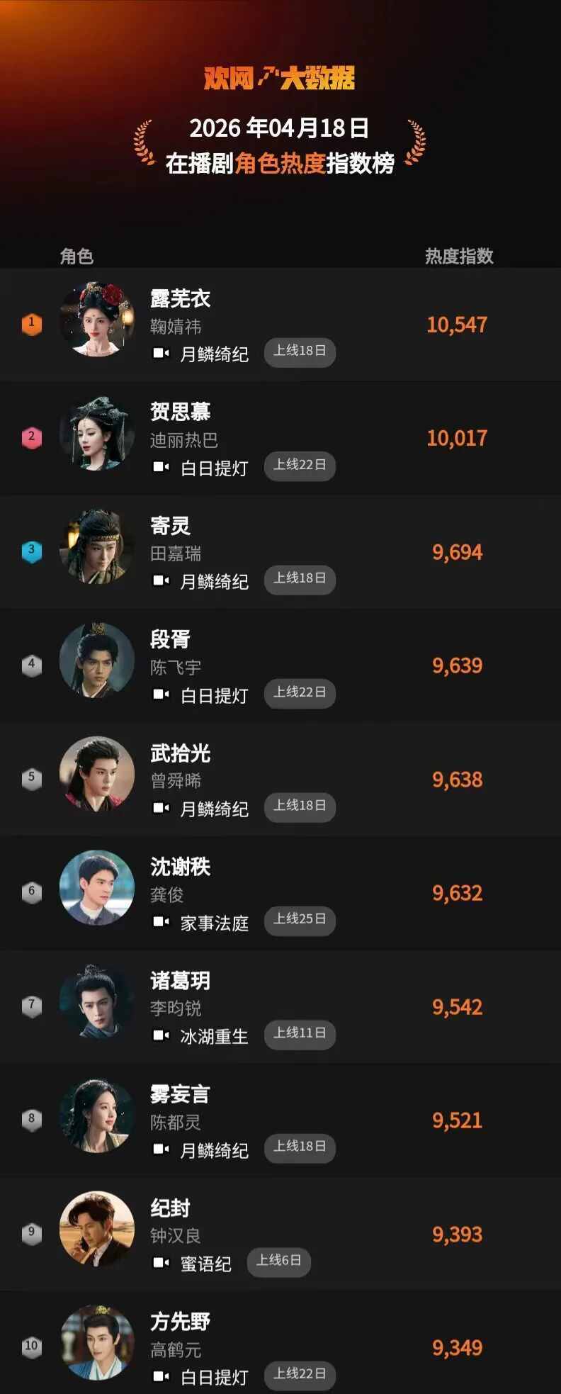 4月18日 欢网大数据【在播剧】角色热度指数TOP10来啦!