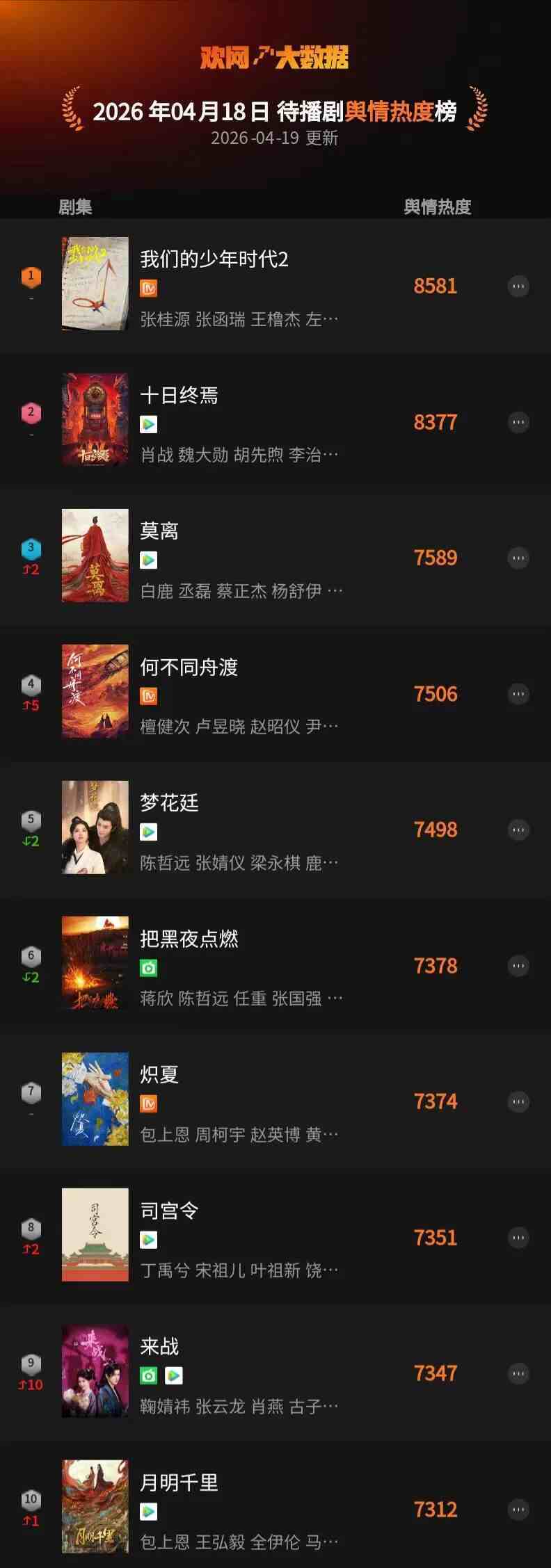 4月18日 欢网大数据【待播剧】舆情热度TOP10来了!