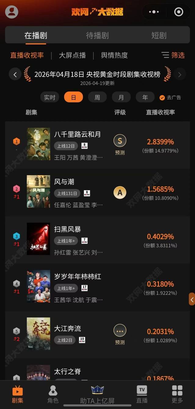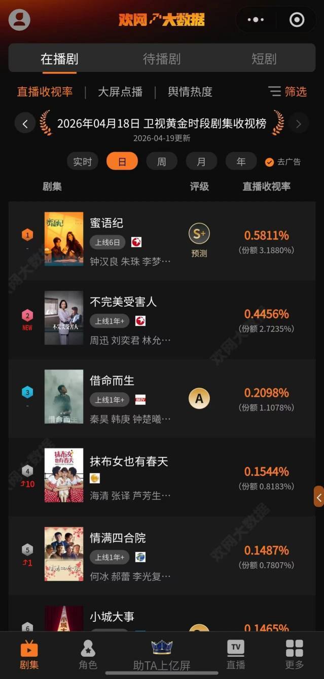 4月18日 欢网大数据【卫视黄金时段】剧集直播收视率来啦!