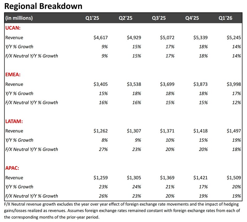 Netflix 把全球收入拆成 UCAN(美国 + 加拿大)、EMEA(欧洲 + 中东 + 非洲)、LATAM(拉美)、APAC(亚太)四个区域。Q1 2026 的区域营收数据是这样的: