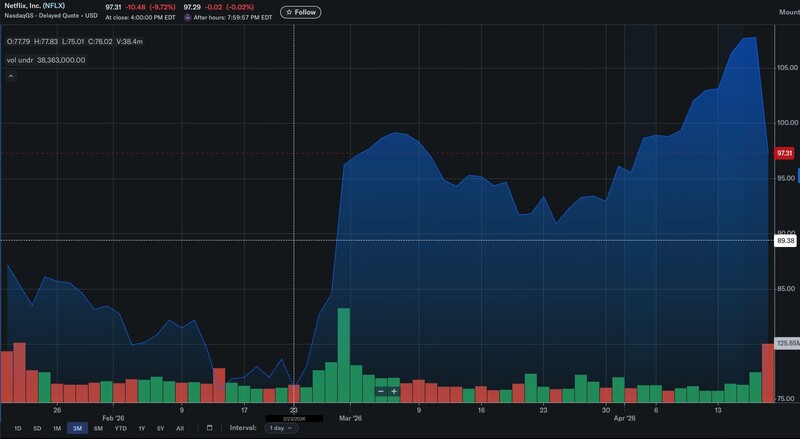 在财报前一周,主流分析师几乎都在讲述同一个故事:Netflix 退出 WBD 竞购、回归基本盘、凭借定价权和广告业务"怎么调价都能赢"。MoffettNathanson 的 Robert Fishman 写报告说 Netflix 可以大胆地在高端无广告层持续提价;Madison & Wall 的 Luke Stillman 告诉 Business Insider,订阅价格的上行空间比大多数人想象中更长;股价从 2 月底的低点反弹超过 40%。