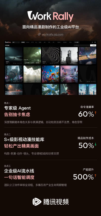 Work是工作,Rally是集结号。WorkRally不仅是效率工具,更是一个让创作团队真正聚在一起、持续向前推进的工业级AI平台。WorkRally的发布,标志着AI在漫剧领域的应用,正在从分散工具阶段迈向工业化体系阶段。随着平台化能力的成熟,精品漫剧内容的生产将逐步走向标准化、规模化与智能化并行的新模式。未来,腾讯视频将持续推进AI技术与内容创作的深度融合,期待与更多创作团队及行业伙伴接力向前,共同探索AI时代内容生产的新可能。