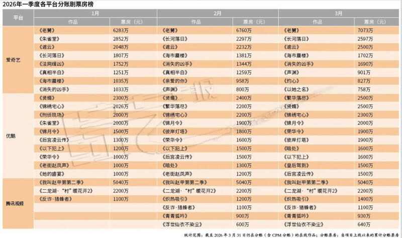 据平台官方信息,2026年一季度,腾讯视频分账票房破千万元的剧集共13部(2000万元以上6部);爱奇艺分账票房破千万元的剧集共8部(2000万元以上4部);优酷分账票房破千万元的剧集共4部(2000万元以上2部)。整体来看,一季度分账榜单既是三大平台用户画像的精准投射,也是分账剧市场发展趋势的集中体现。年代剧、悬疑剧撑起大盘,男频、新设定等题材内容亮点不断,微短剧、中剧成为长视频平台竞争新战场。