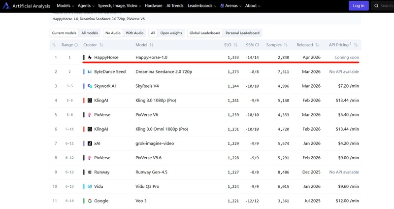 4月初,一个名为HappyHorse-1.0的神秘模型悄然登顶权威AI评测平台Artificial Analysis的榜首。