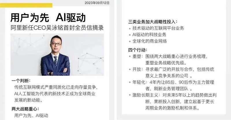 上任后他迅速确立“用户为先、AI驱动”两大战略,并宣布三年投入3800亿元建设云与AI基础设施。