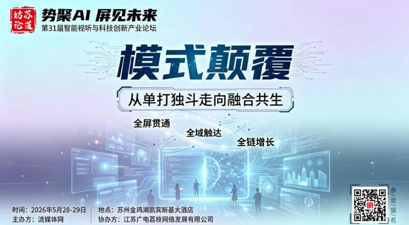 正是带着对这些问题的思考,2026年5月28日至29日,在苏州金鸡湖凯宾斯基大酒店,「姑苏论道暨第31届智能视听与科技创新产业论坛」将汇聚产业链各方的思考者与践行者,深入探讨AI如何重塑视听商业,共寻跨界共生的落地路径。