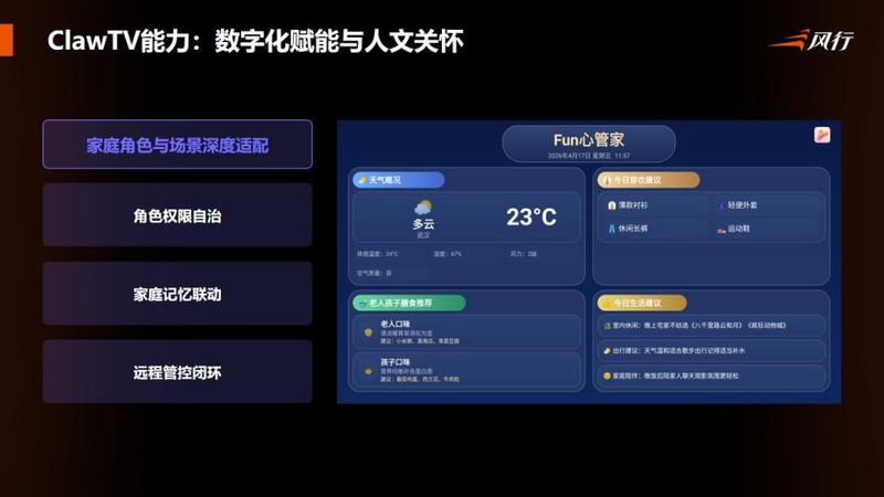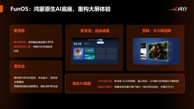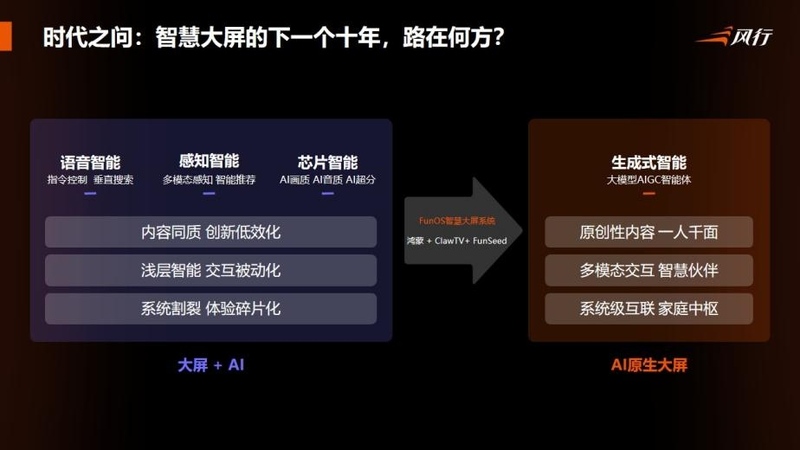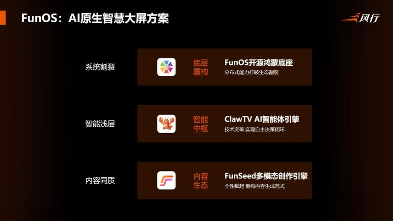 我们在思考大屏如何迎接AI时代的深刻变化,风行的 FunOS智慧大屏系统,尝试通过 OpenHarmony 提供底座,ClawTV 作为大脑,再由 FunSeed 激活创意,最终通过系统级的重构,实现从“大屏+AI”到“AI原生大屏”。