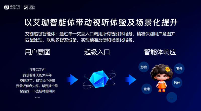 在智慧家庭领域,华数自研多场景融合智能体“艾珈”,实现自然语音交互、全屋智能调度,提供“一句话即达”的智慧服务,贯通电视、手机、AI眼镜等多终端。在家政、问诊、配药、看家等多元场景中,“艾珈”深度融入家庭日常。