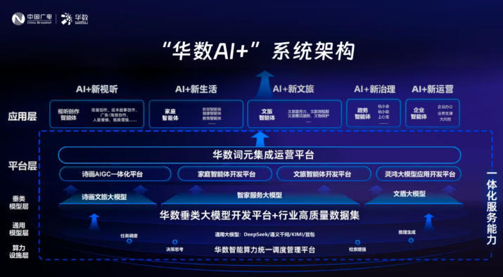 华数已构建系统的“华数AI+”技术架构体系,包括基础算力调度平台、通用大模型工程化能力、行业垂类大模型等,打造“词元集成运营平台”,发挥广电视听具备高频交互、海量内容、算力密集等天然优势,推动广电网络从传统管道运营向人工智能应用服务能力运营转型。