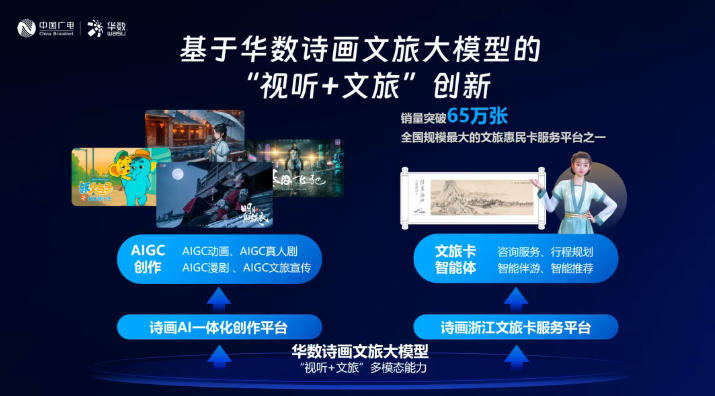 在“AI+视听+文旅”领域,华数自主研发“诗画文旅大模型”,打造两大平台:一是“诗画AI一体化创作平台”,支撑AIGC动画、文旅短剧等内容的高效生产;二是“诗画浙江文旅卡服务平台”,提供智能预约、AI伴游等一站式服务,目前文旅卡销量已突破65万张,成为全国具有影响力的文旅惠民服务平台。