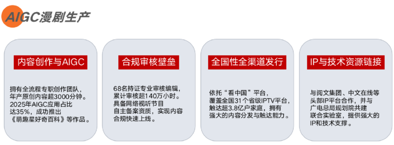 一是AIGC内容定制服务,提供漫剧、科普短片、互动节目等全流程AI制作支持;二是产能共享服务,以自身高效内容生产体系为依托,赋能合作方产能升级;三是IP联合孵化服务,从创意构思到成片落地,与合作伙伴携手打造优质数字内容共探AIGC时代内容产业新蓝海。