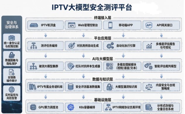 另外,多彩新媒基于多年 IPTV 行业实践,在内容审核、推荐运营及用户交互过程中,已积累了大量真实问题与风险案例。通过构建统一大模型安全测评平台,对过往审核问题、用户交互异常及业务风险进行结构化建模,形成标准化测试与评估机制,实现对大模型输出的全面检测与量化评估,从而支撑模型安全接入与持续优化,保障 IPTV 业务的合规性与稳定性。