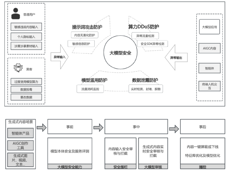 AI内容安全方面,针对交互流程缺乏全链路闭环问题,构建“事前预防-事中监测-事后处置”闭环体系,确保平台服务内容的可管可控。
