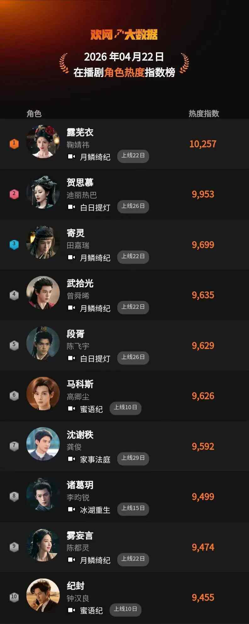 4月22日 欢网大数据【在播剧】角色热度指数TOP10来啦!