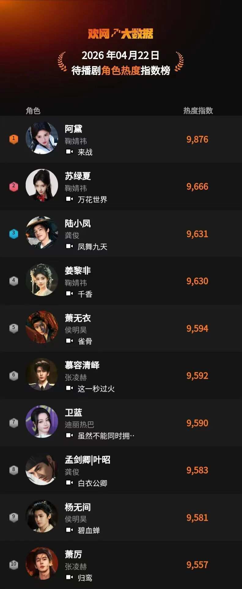 4月22日 欢网大数据【待播剧】角色热度指数TOP10来啦!