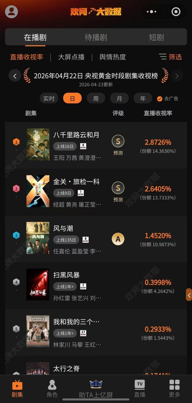 4月22日 欢网大数据【央视黄金时段】剧集直播收视率来啦!