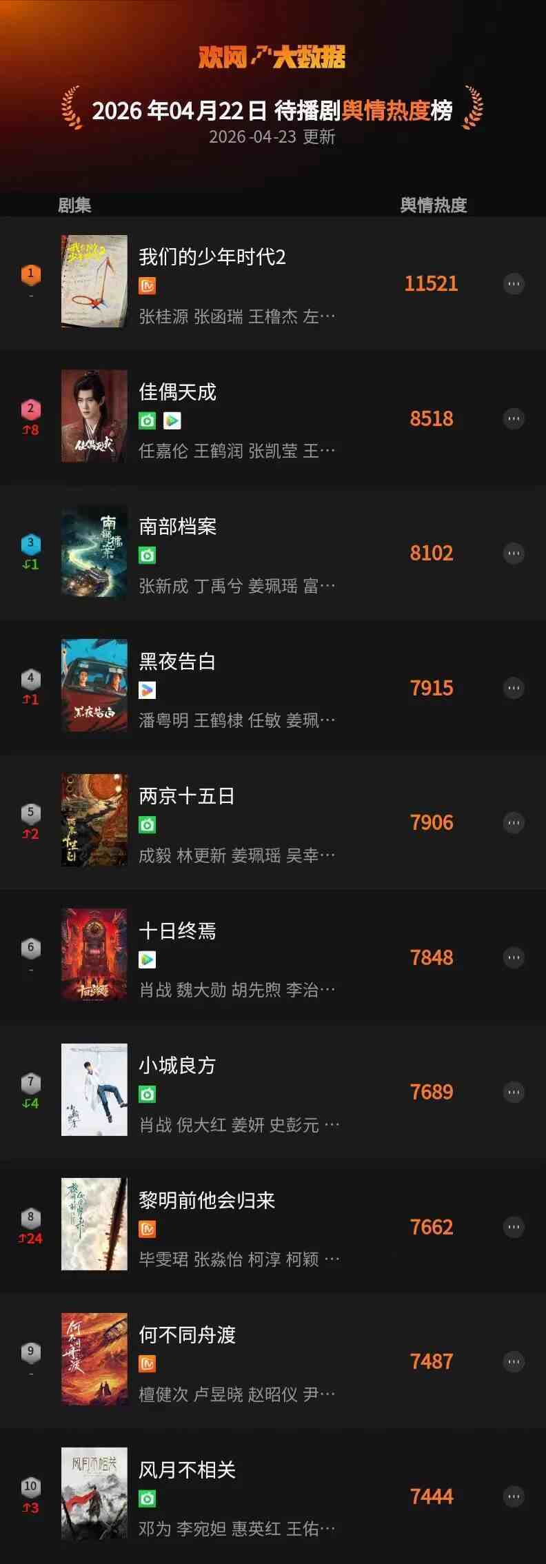4月22日 欢网大数据【待播剧】舆情热度TOP10来了!
