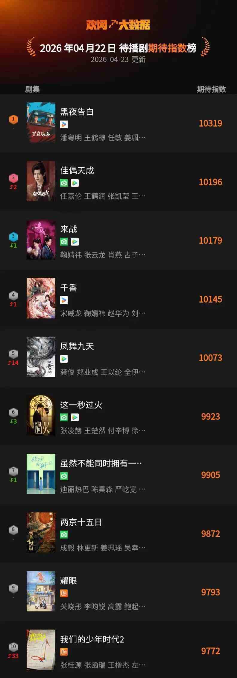 4月22日 欢网大数据【待播剧】期待指数TOP10来了!