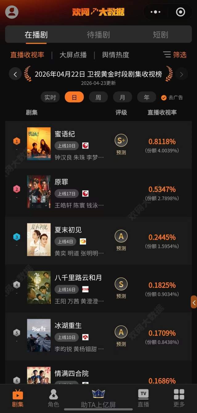 4月22日 欢网大数据【卫视黄金时段】剧集直播收视率来啦!