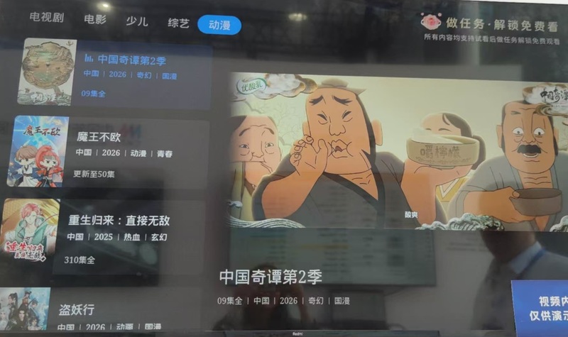 现场演示显示,在山东IPTV首页EPG的“免费”栏目有“山东IPTV FAST专区”入口,宣传语是“做做任务,免费畅看全集”,在视频播放过程中,也会在右上角提示“做任务解锁免费看”,而且所有内容支持先试看再决定是否解锁。