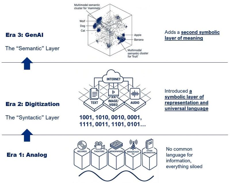 Shapiro 把这一层叫作"语义层(semantic layer)",把这种能力概括为一句话:数字化让"信息"变得可计算。GenAI 让"意义"本身变得可计算。