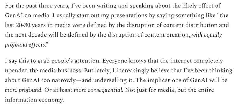 最近,他发表了一篇新文章《Computable Meaning and Computable Information》,这次则给了我一个不小的惊喜。文章开头,他坦率地承认:过去三年自己一直在写、在讲 GenAI 对媒体行业的影响,但越写越觉得,之前把问题看得“太窄了,把它说小了”。